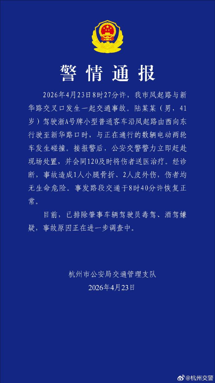 中国网4月23日讯杭州市公安局交通管理支队通报,4月23日8时27分许,杭州市凤起路与新华路交叉口发生一起交通事故。陆某某(男,41岁)驾驶小型普通客车沿凤起路由西向东行驶至新华路口时,与正在通行的数辆电动两轮车发生碰撞。接报警后,公安交警警力立即赶赴现场处置,并会同120及时将伤者送医治疗。经诊断,事故造成1人小腿骨折、2人皮外伤,伤者均无生命危险。事发路段交通于8时40分许恢复正常。目前,已排除肇事车辆驾驶员毒驾、酒驾嫌疑,事故原因正在进一步调查中。