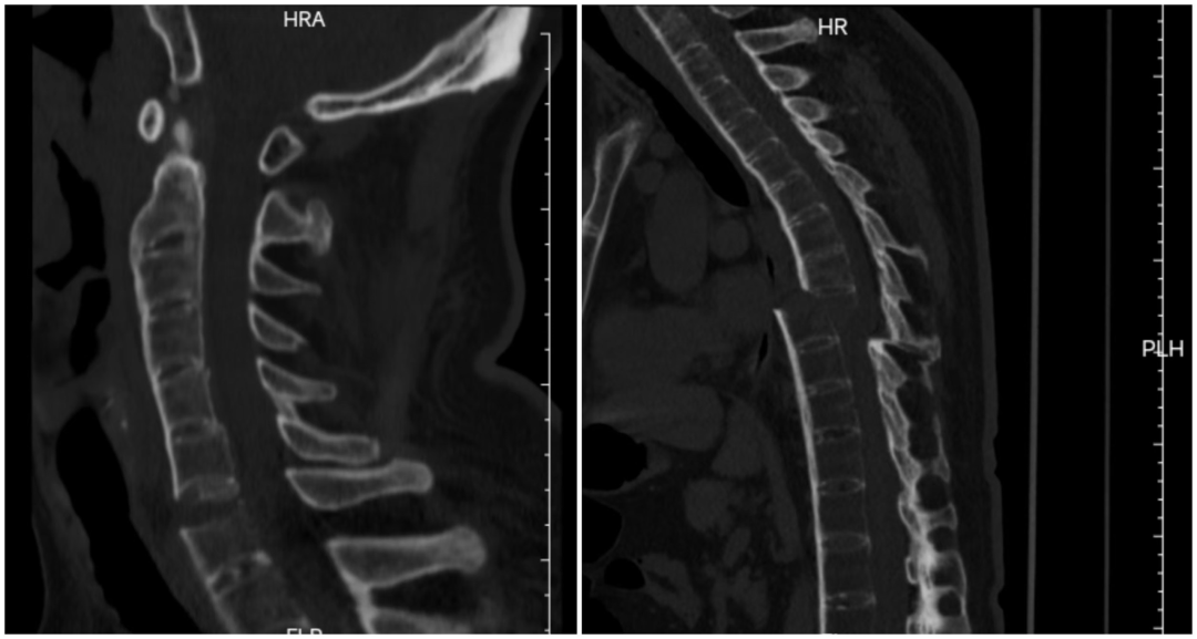 该患者因车祸导致颈椎横贯性损伤;同时合并胸椎完全性骨折脱位,椎体漂浮、脊柱连续性中断。