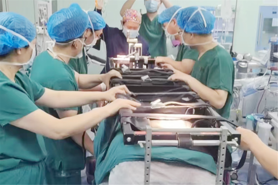 面对危重病情,东院脊柱外二科王磊升主任医师团队联合麻醉科、手术室、外科重症监护病房以及电生理室等科室,为患者量身定制个性化手术方案:先在Jackson床上仰卧位下行颈椎前路固定,再经180°精准翻转至俯卧位,实施颈椎后路固定及胸椎骨折脱位复位内固定。针对麻醉后翻身这一致命风险环节,樊晓光副主任医师带领医疗组成员提前开展专项演练,对人员分工、脊柱固定及应急处置等每一步均进行精准细化,全面筑牢手术安全防线。