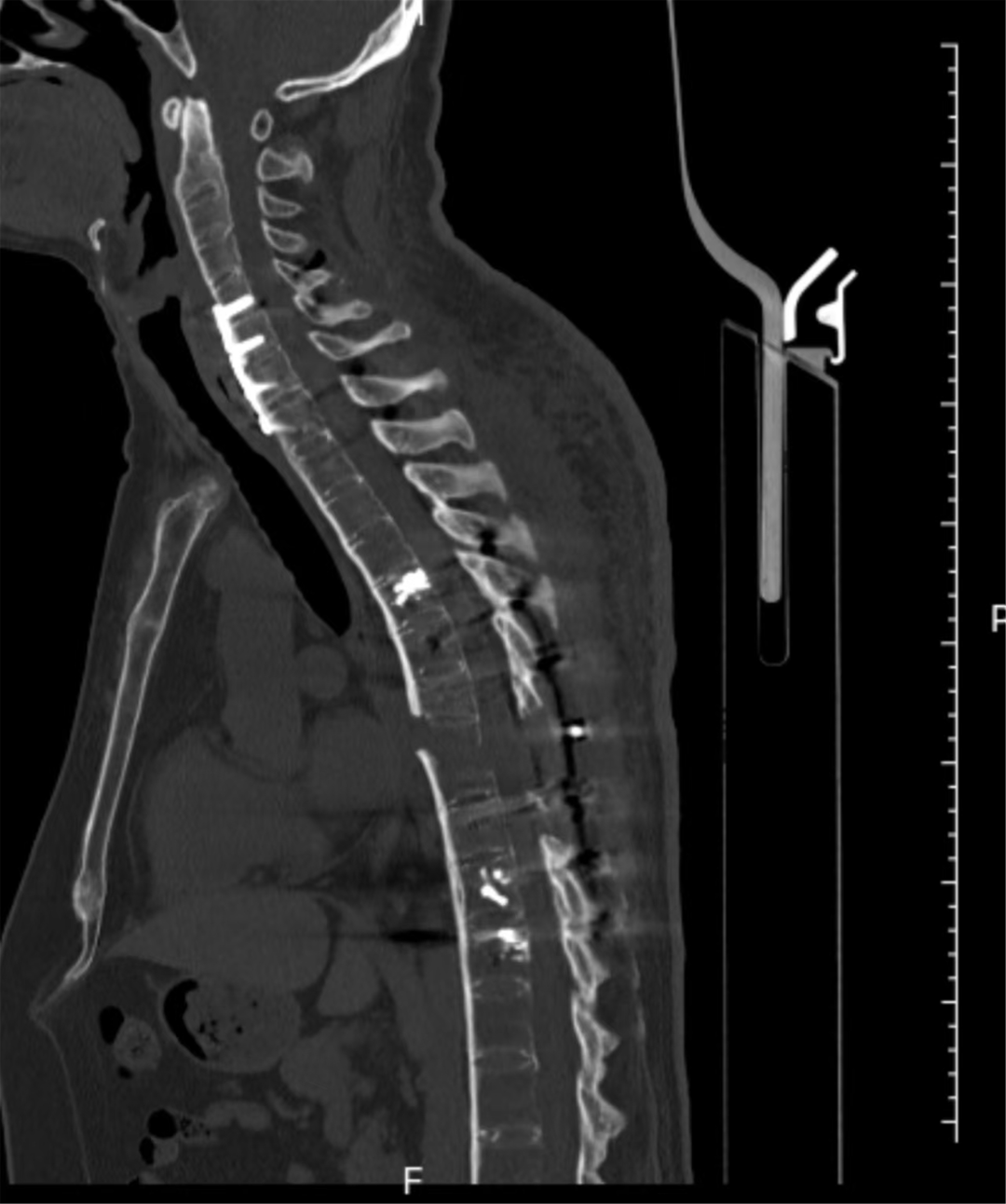 经过13个小时的手术,患者的颈椎及胸椎脊柱序列得以重建