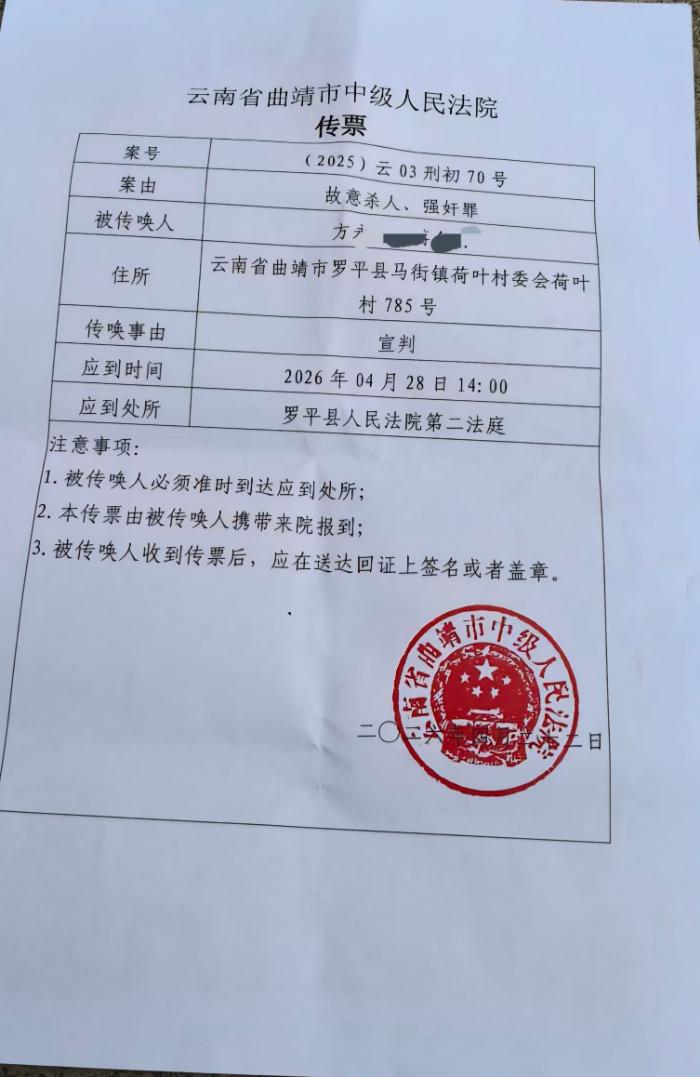 被害人母亲蒋女士告诉记者,她是24日早晨收到法院传票。记者看到传票上写明,本案案由为故意杀人、强奸罪,将于4月28日在罗平县人民法院开庭。“我们不需要任何民事赔偿,只想凶手得到严惩,杀人偿命。”蒋女士说。