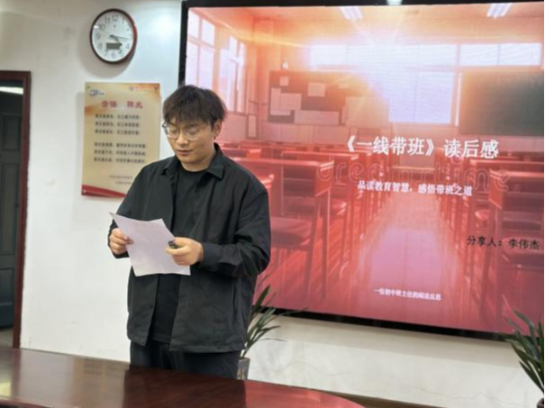 李伟杰老师分享了《一线带班》的阅读感悟,李老师强调《一线带班》不是一本教我们“管理学生”的书,而是一本引导我们“深耕教育”的书。在带班的细节里,看到了日常的琐碎、育人的责任,也看到了教育的温度与智慧。从书中习得实用的带班方法。作为教师,要扎根一线,用心带班;细化班级管理,守护学生成长。