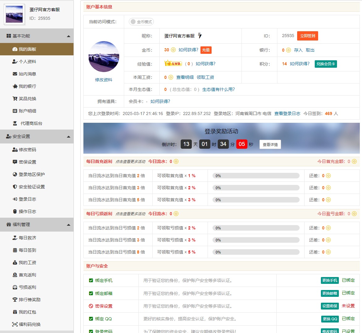 蛋仔网大致可以分为三个大区:赚gold coin、休闲游戏区、礼品商城,您免费注册后,
