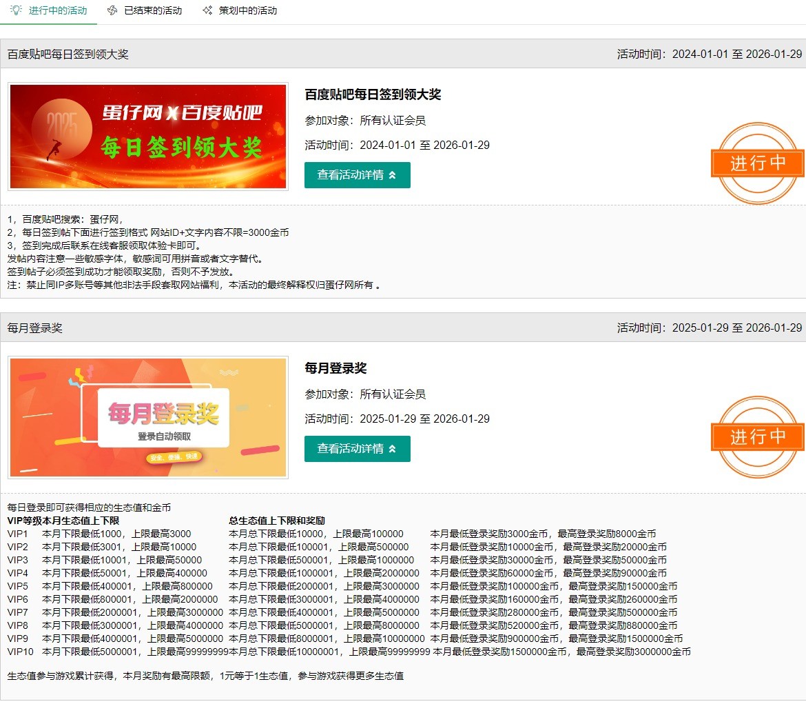 2,登录奖励,网站根据用户生态值,半月开启一次登录奖励活动,每次最少可获得8000金币的奖励,