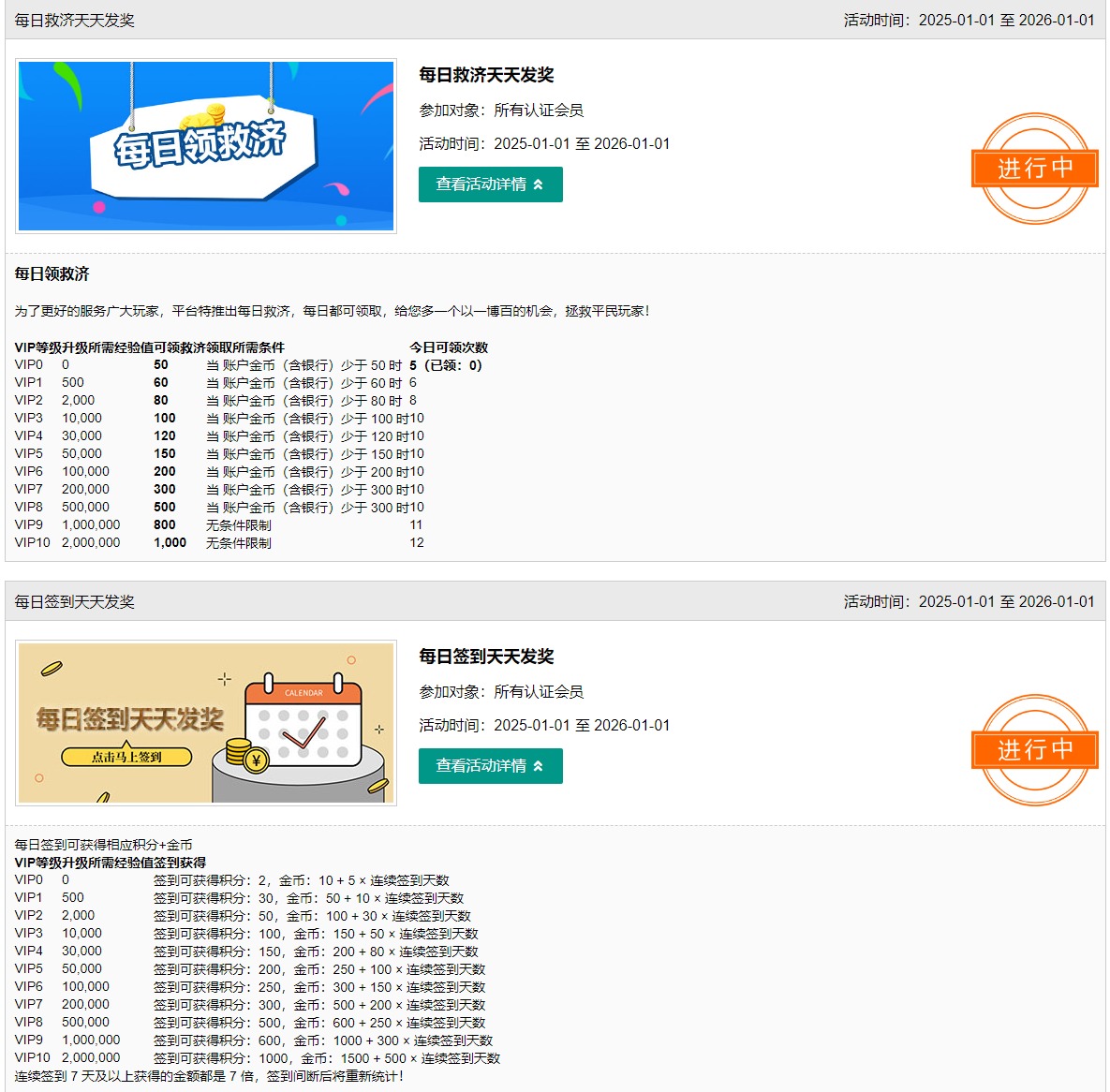 6,每日救济签到福利,根据会员的VIP等级领取,等级越高,领取的救济和签到福利越高。
