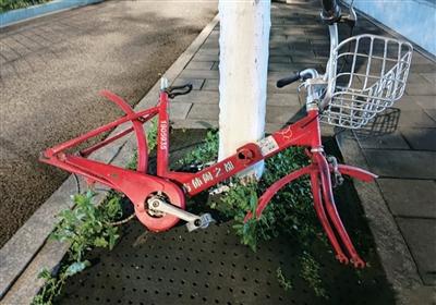 “这一辆估计是被人拆了,有些人自己不买,从哪里弄了一个旧自行车,把小红车上好用的东西像车轮、坐垫拆走自己用。今天早上有个扫垃圾的想把这个扔到我车上,让我拿去卖。我说不敢拿,拿了要罚款。这个东西收废铁的大型收购站都不敢收,里面有定位的,找到的话不得了,要罚款。”