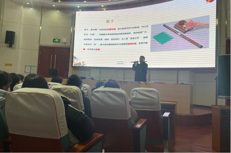 讲堂上,于海涛从古代“八音”分类讲起,梳理吹管乐的源流脉络,如数家珍般介绍笛、箫、埙、陶笛、葫芦丝、巴乌等多种民族乐器。他还现场演奏了九首经典曲目,让理论在音符中生动绽放。