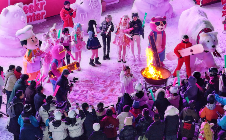 现场有歌手献艺,摇滚、民谣轮番登场,人们跟着节奏挥舞手臂,欢呼声此起彼伏。一旁的烤全羊香气扑鼻,人们排队品尝。汆汤水饺同步供应,现场还穿插抽奖环节,赠送滑雪券、文创礼品等。在篝火的衬托下,人们沉浸在音乐、美食带来的快乐中,度过难忘的夜晚。