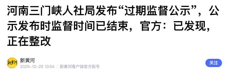 12月25日,有网友在社交平台发文称,其在河南省三门峡市人力资源和社会保障局官网发现,该局于12月23日发布的一则“2025年度三门峡市中小学教师、农村中小学教师副高级职称评审通过人员名单公示”中,存在监督截止日期比公示日期还早1天的情形,导致公示发布时监督时间已结束,此事引发关注。25日中午,三门峡市人社局办公室相关负责人就此事回复新黄河记者称,该局已发现此事,目前正在整改。