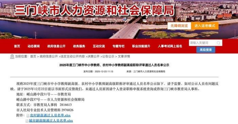 据网友所发布信息显示,2025年12月23日11点13分,三门峡市人力资源和社会保障局官网发布关于“2025年度三门峡市中小学教师、农村中小学教师副高级职称评审通过人员名单公示”。该公示中提及,“现将2025年度三门峡市中小学教师副高级,农村中小学教师副高级职称评审通过人员名单公示如下,请予监督,如对公示人员有问题反映,请于2025年12月22日前以书面形式反馈给我们”。公示信息中同时标注有该市教育局、人社局等单位地址与各局相关科室联系电话。“也就是说,上述公示发布时,监督日期已经结束,请问这样的公示意义何在,公众又如何进行监督。”上述网友如是发问。
