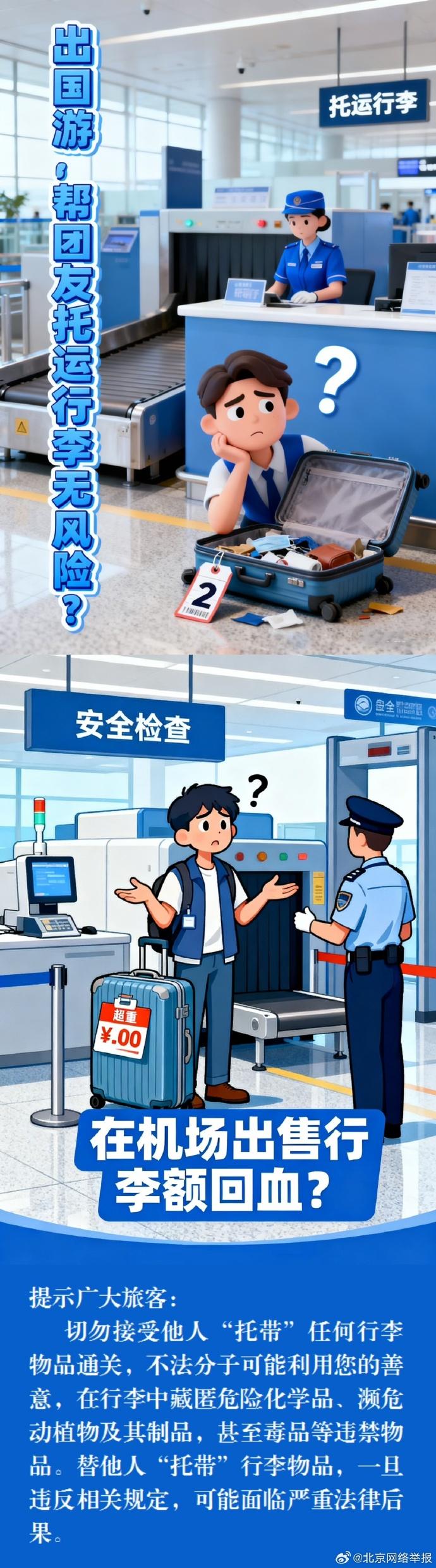 出境游已成为许多人假期休闲的热门选择。出行中,不少人认为“出国游,帮团友托运行李无风险”“可在机场出售行李额回血”,事实真的如此吗?警惕!不法分子可能利用您的善意,在行李中藏匿危险化学品、濒危动植物及其制品,甚至毒品等违禁物品。替他人“拖带”行李物品,一旦违法相关规定,可能面临严重法律后果。