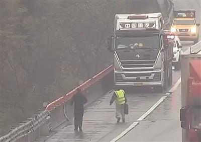 12月20日下午2点多,在杭新景高速建德段鸡毛坞隧道附近,一辆半挂车打着双闪停在应急车道,车上下来一黑衣男子,一路小跑奔往护栏外。另一身穿反光背心女子,拿着棍子绑着一件反光背心,在半挂车后方不停挥舞。