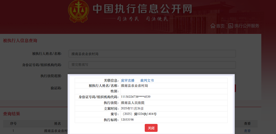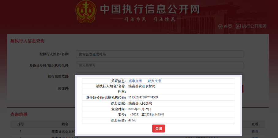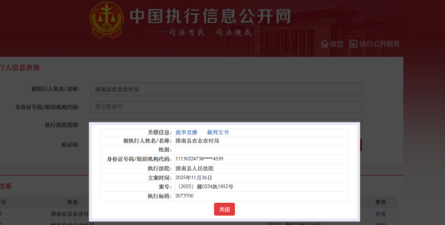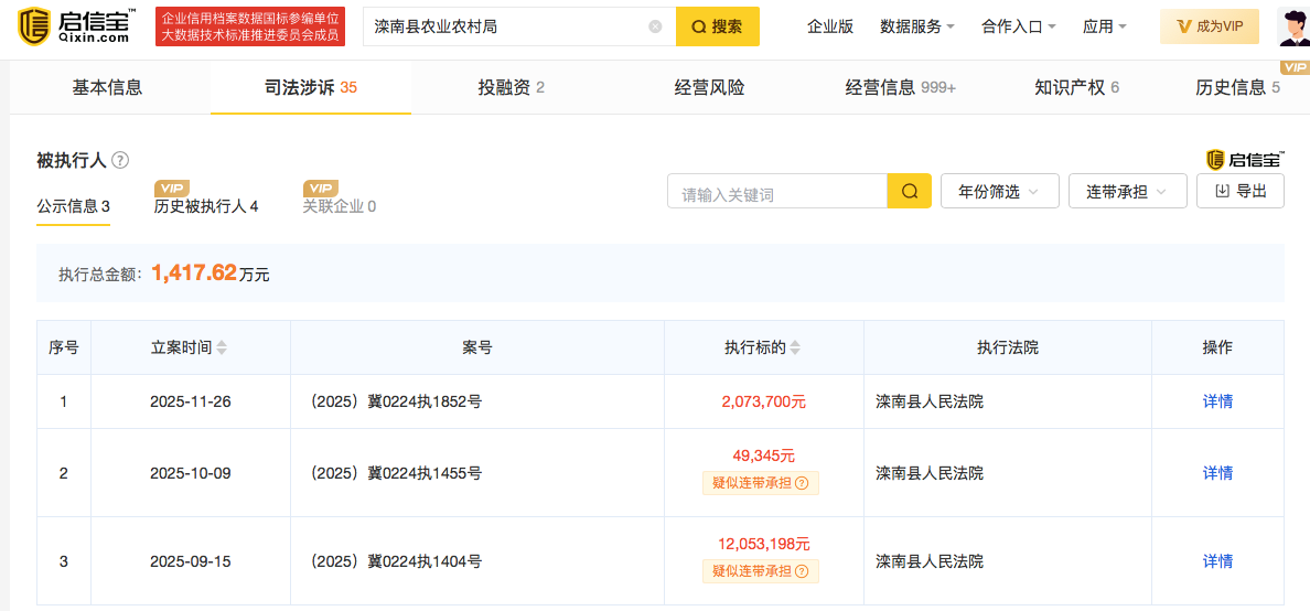 值得关注的是,启信宝数据显示,滦南县农业农村局目前是被执行人,被执行总金额高达1417.62万元,经核查中国执行信息公开网,数额一致。