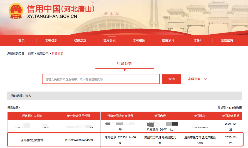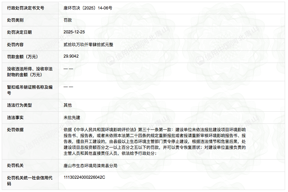 据信用中国(河北唐山)官网公开信息,2025年12月25日,因未批先建,滦南县农业农村局被唐山市生态环境局滦南县分局罚款29.9042万元。