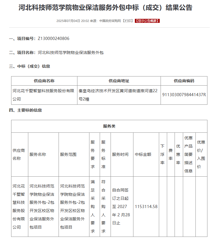 据中国河北政府采购网官网信息,河北省财政厅12月30日发布了“河北科技师范学院物业保洁服务外包—开发区校区物业保洁服务外包项目”因中标公司河北花千墅智慧科技服务股份有限公司中标金额不合理,被投诉。