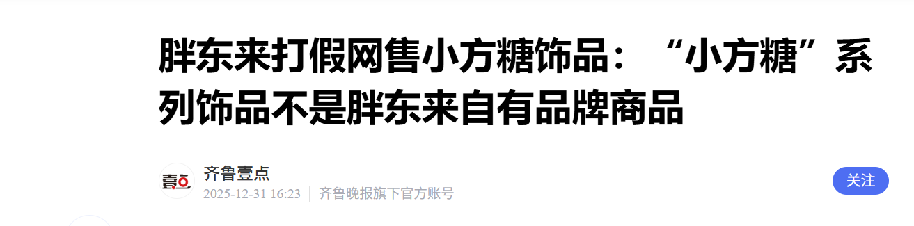 “小方糖”系列饰品不是胖东来自有品牌商品,也不是胖东来生产商品。目前,该系列饰品已在胖东来所有线下门店及线上渠道暂停销售,任何声称可通过“胖东来”渠道购得此款商品的说法,均不属实,请大家注意甄别!请有上述行为的组织或个人,立即停止伪造胖东来购物凭证及以胖东来名义进行虚假宣传与不正当竞争的销售行为。