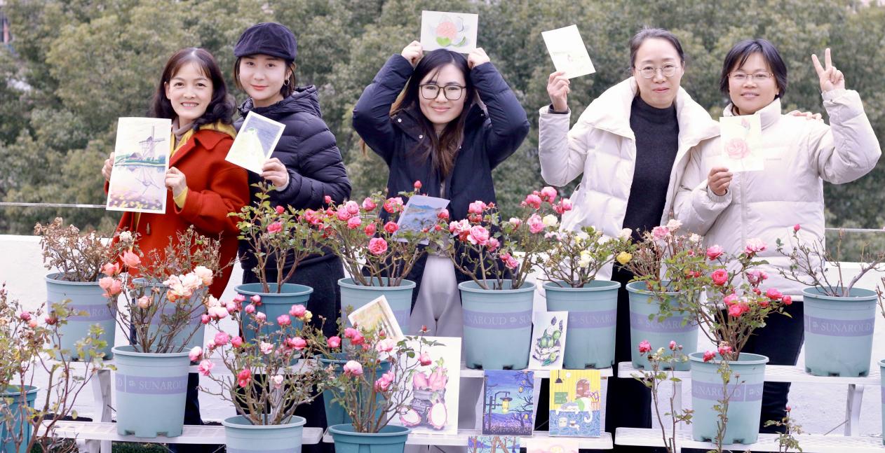 课程的收官之课别出心裁——在社区精心打造的“共享花圃”中举办一场别开生面的“花间画展”。一幅幅以自然、生活、社区风貌为主题的彩铅画作被精心布置在花架与绿植之间,与冬日暖阳交相辉映。学员驻足欣赏,互相点评,分享创作心得。