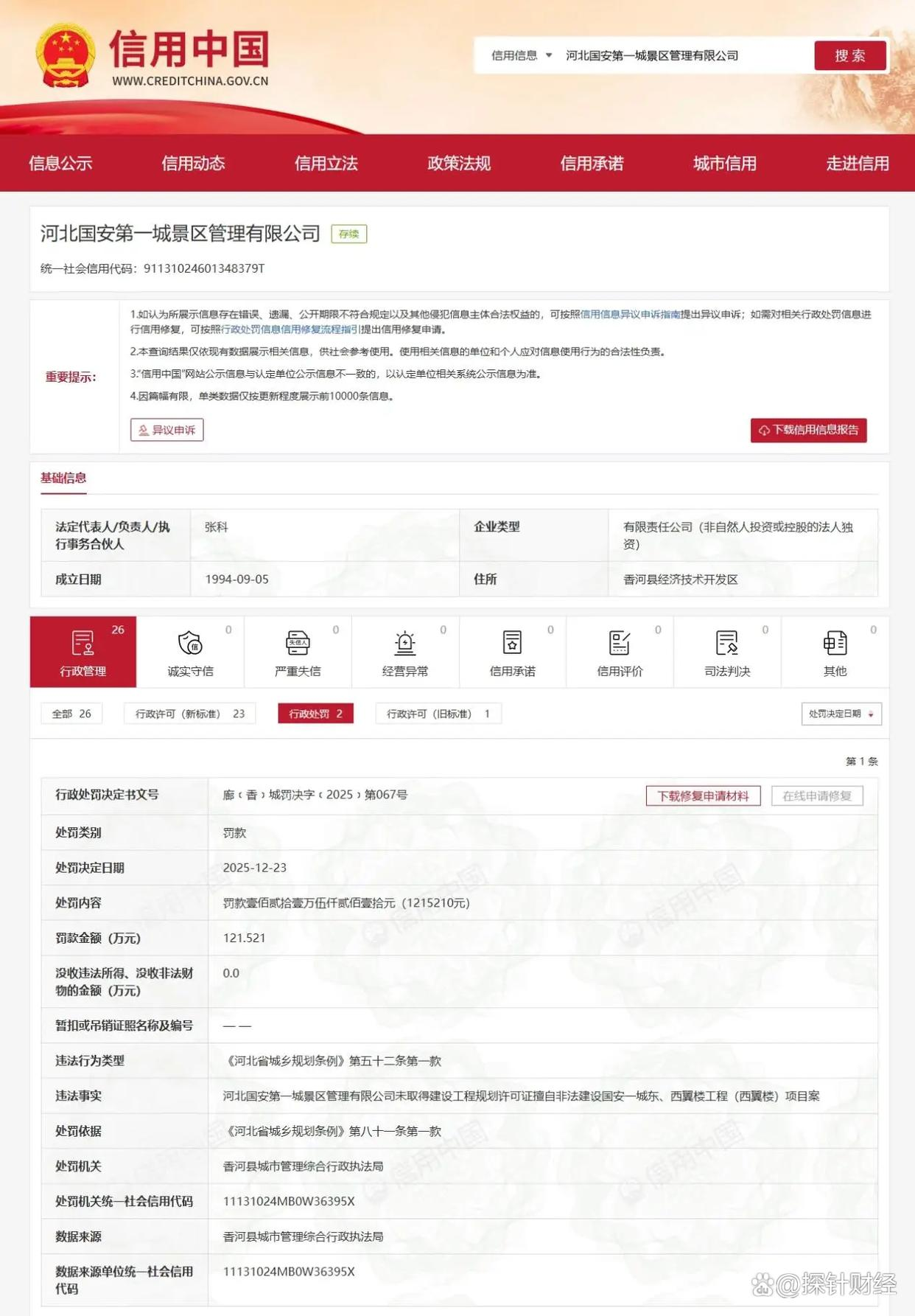 公开信息显示,该公司此前已多次因类似违规行为被处罚。2025年12月23日,其因未取得建设工程规划许可证擅自建设“国安一城东、西翼楼工程(西翼楼)项目”被罚121.521万元;2024年10月30日,因2016年7月在第一城景区内无证建设被香河县安平镇人民政府处罚188.856万元。