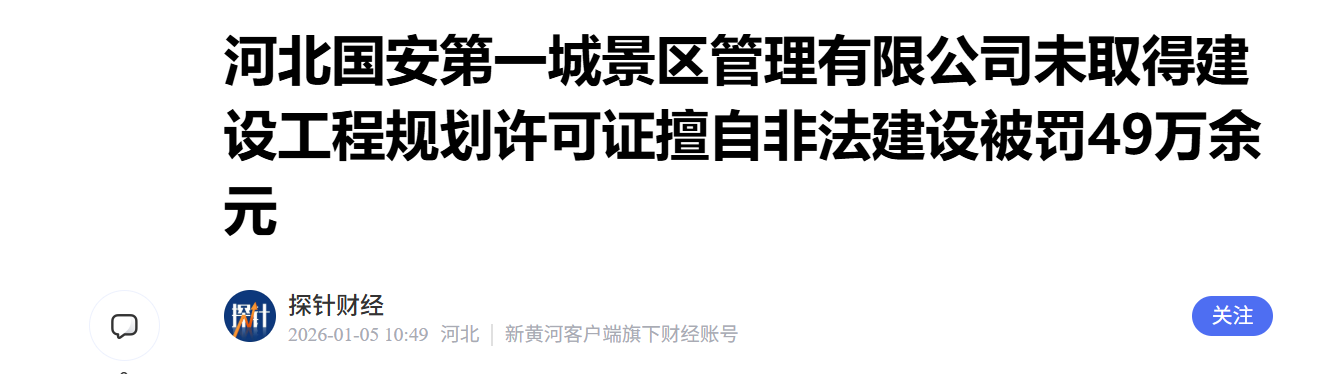 未批先建!河北国安第一城景区管理有限公司被罚49万余元