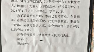 帖中所附照片显示,这则《沉痛告知》中称,健身房的创始人(也是唯一股东)全权管理人杨某因突发意外,经抢救无效,于2026年1月7日不幸离世,年仅30岁。为了逝者后事处理,该店已暂停营业。