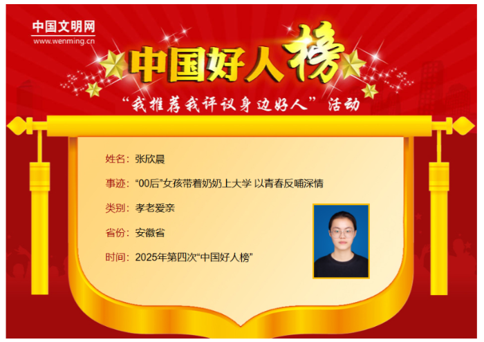 大皖新闻讯 1月23日,中央精神文明建设办公室发布2025年第四次“中国好人榜”,安徽7人荣登榜单,其中,大皖新闻2025年11月6日曾报道的“00后”女孩张欣晨带着奶奶上大学,以青春反哺深情,感动了很多读者,她在此次评选中荣登“孝老爱亲”类别“中国好人榜”。