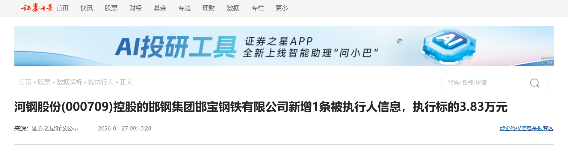 邯钢集团邯宝钢铁公司新增1条被执行人信息,执行标的3.83万元
