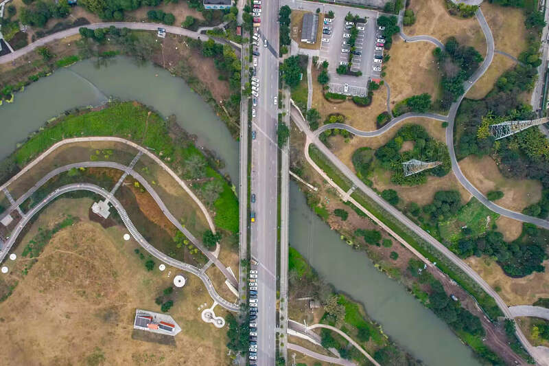 桃花溪锦绣路段俯拍图。桥路、河湾与步道错落交织。重庆移通学院陈媛/摄