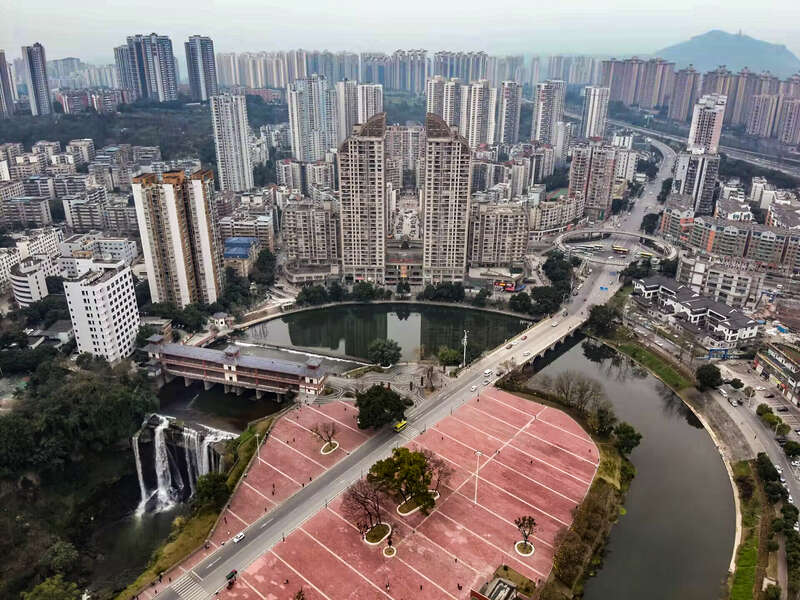 航拍镜头下的桃花溪城市瀑布,展现山城立体空间与自然水景的融合。重庆移通学院陈媛/摄