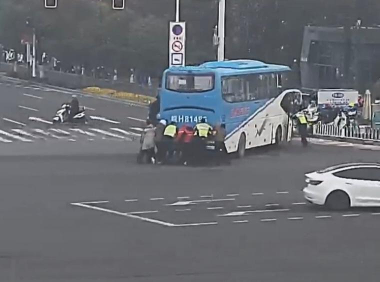 安庆街头现暖心“推车侠” 客车抛锚,交警市民合力推车