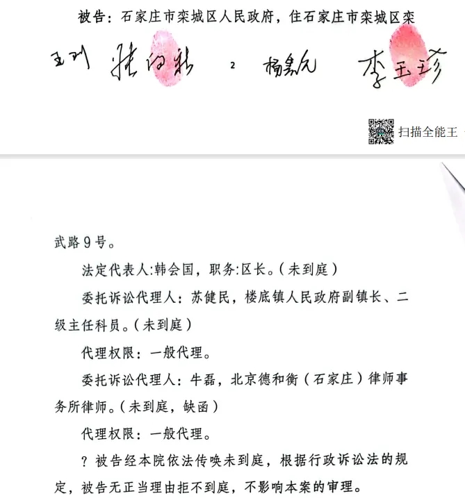 庭审笔录显示,当天栾城区政府委托诉讼代理人有两人,一人是栾城区娄底镇人民政府副镇长、二级主任科员苏健民,一人是北京德和衡(石家庄)律师事务所律师牛磊。