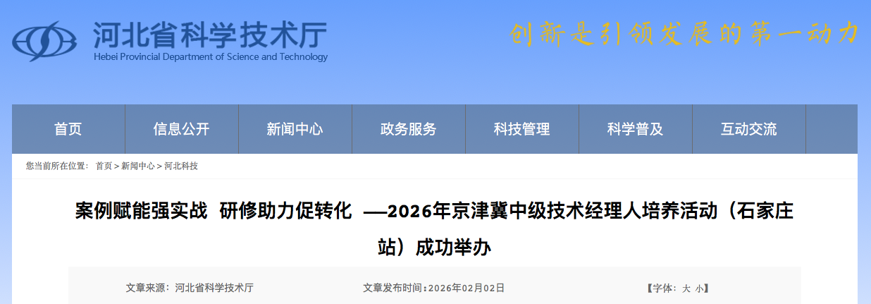 为强化科技成果转移转化人才支撑,助力特色产业集群发展,1月29日至30日,2026年县域特色产业集群科技成果转移转化知识研修暨京津冀中级技术经理人创新能力提升系列培养活动(石家庄站)在石家庄市高新区京津冀协同创新示范园成功举办。本次活动在河北省科学技术厅指导下,由河北省科技成果转化促进中心(科技大厦)、石家庄市科学技术局、河北省技术市场协会联合主办,吸引了来自高校、科研院所、科技型企业、投资机构及政府科技管理部门的60名学员参加本次培训。