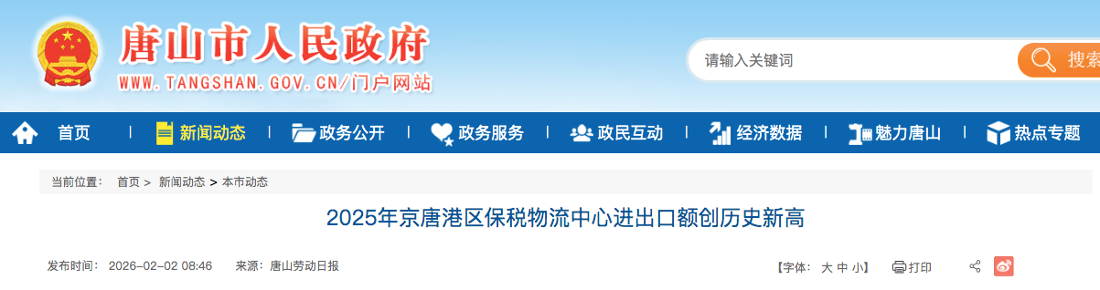 创历史新高 2025年京唐港区保税物流中心进出口额达76.38亿元