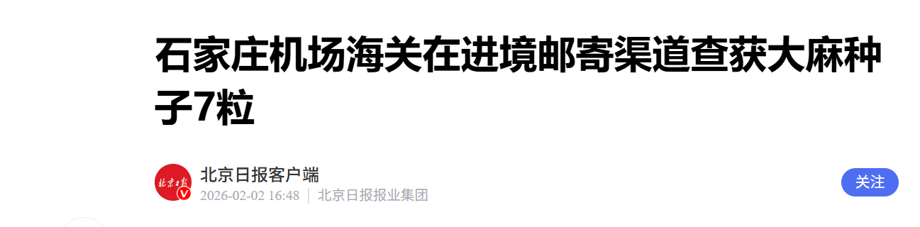石家庄机场海关在进境邮寄渠道查获大麻种子7粒