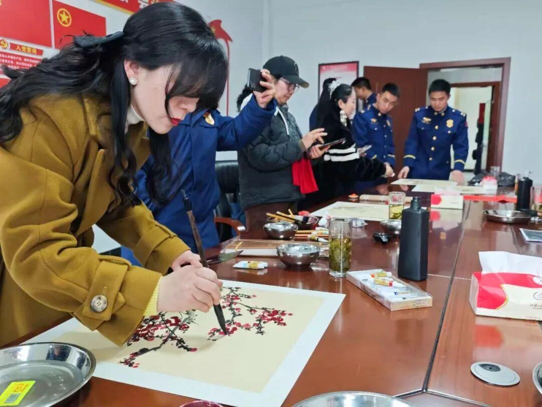文艺演出落幕後,文化互动环节温情接续。受邀书法家、美术家现场挥毫泼墨、创作丹青,将对消防指战员的崇敬之情与新春祝福融入笔端。书法家翟佳、杨坤锋以遒劲笔触书写春联、福字,笔墨间尽显吉祥寓意;美术家金泽美、黄兰、许冬梅精心勾勒牡丹、梅花、兰草等吉祥图景,笔下繁花竞放、草木含情,既寄托着新春祝福,更彰显出消防指战员坚韧不拔、向阳而生的精神风貌。消防指战员围站身旁,挑选心仪的作品,脸上洋溢着喜悦的笑容,浓厚的墨香为消防营区增添了别样的节日氛围。