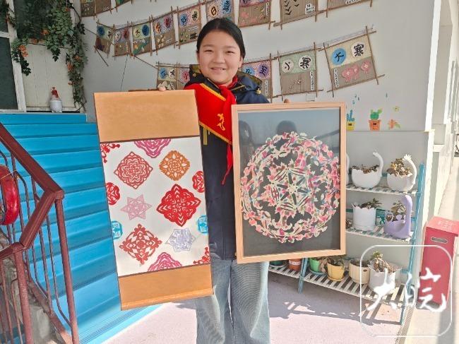 作为班长,许梦洁曾组织过传统文化分享会,与同学们分工合作,带领更多的同学学习剪纸技巧,还将剪纸作品装饰校园。还有同学因为剪纸悄悄发生了改变。“班里有几个注意力不集中、坐不住的同学,自从接触到剪纸,也慢慢能够沉下心来,专心去完成一幅作品了。”胡老师说。
