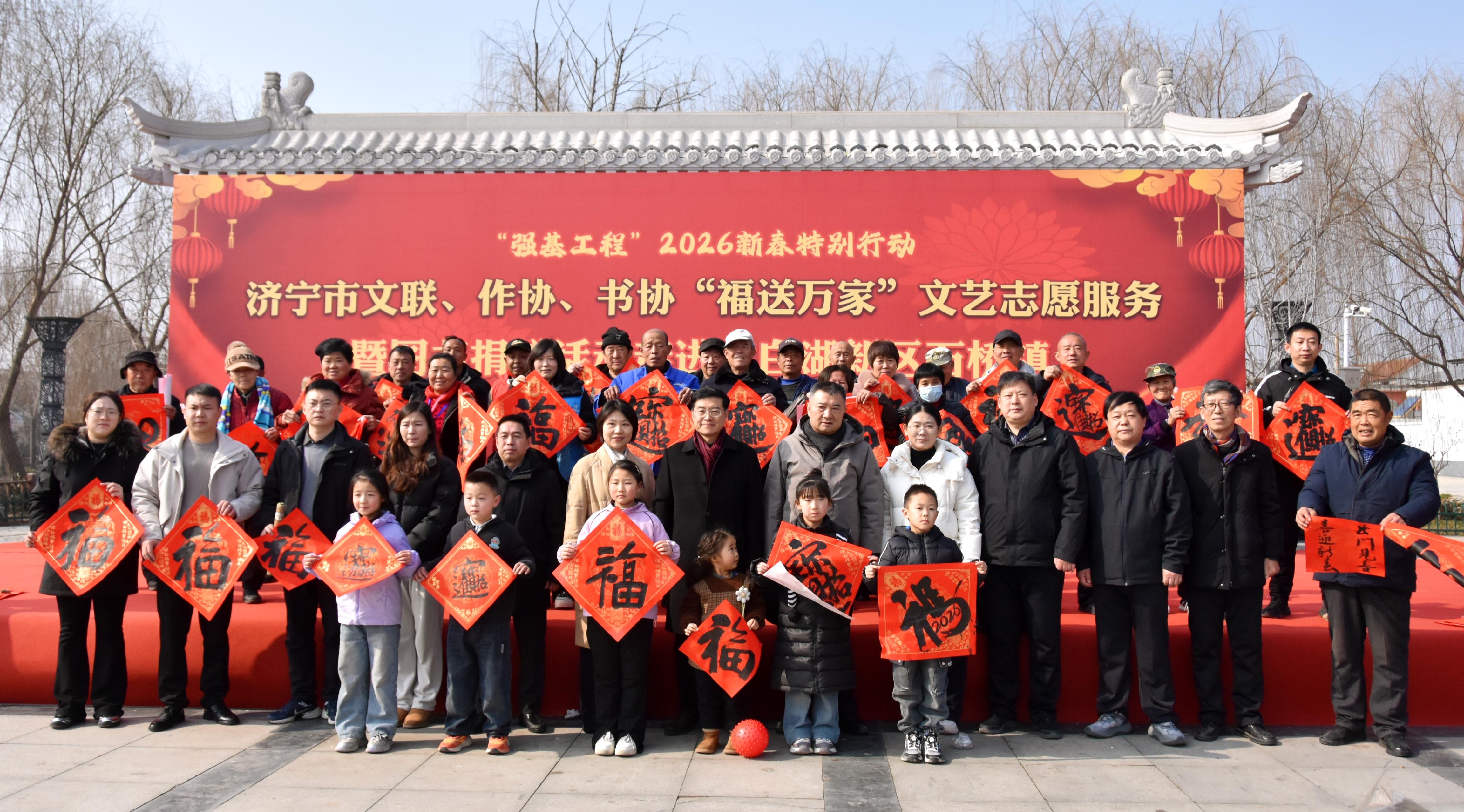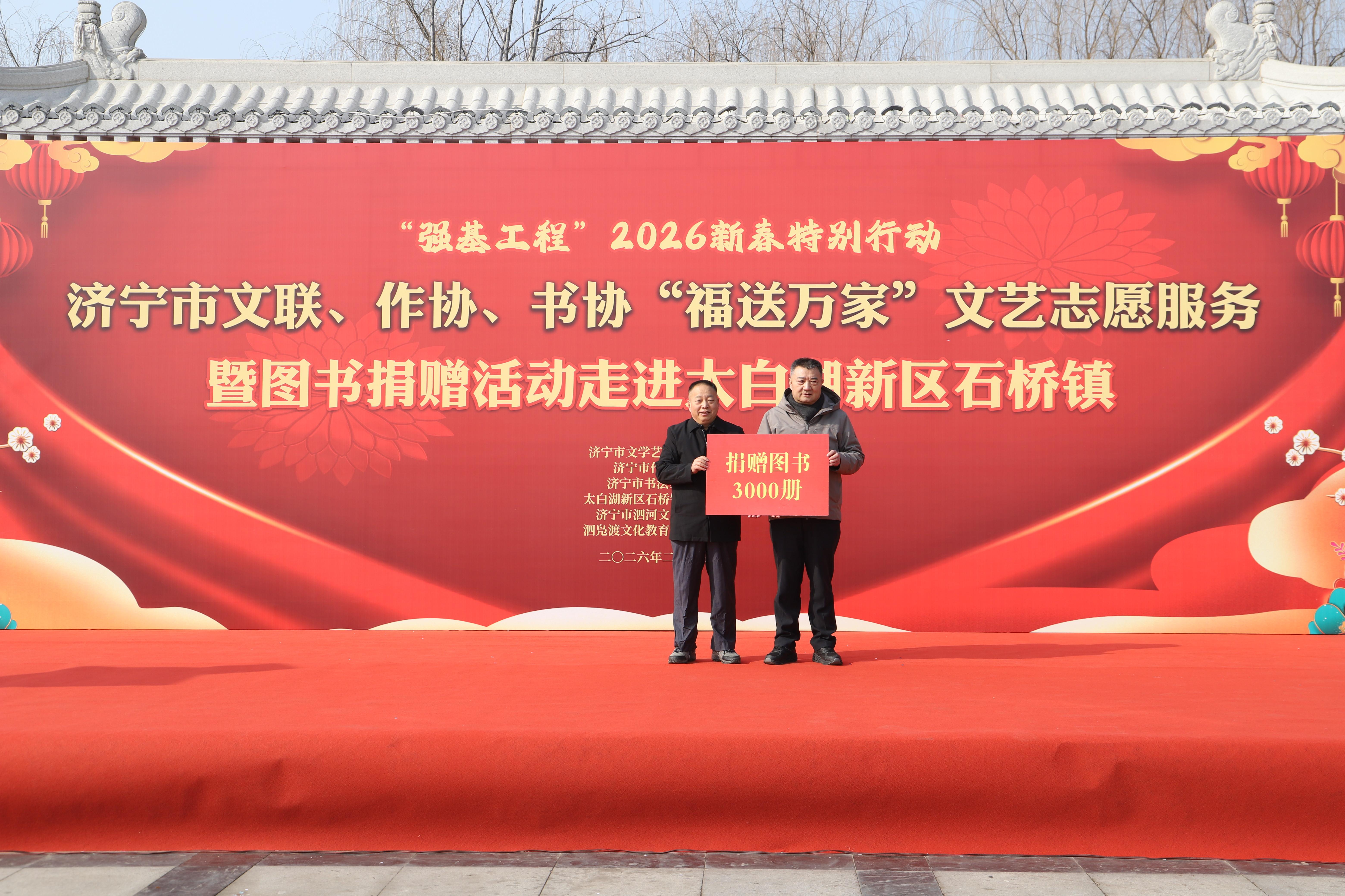 鲁网2月5日讯2月4日上午,“强基工程”2026新春特别行动——济宁市文联、作协、书协“福送万家”文艺志愿服务暨图书捐赠活动在太白湖新区石桥镇举行。济宁市书法家协会主席谢长伟、市作家协会主席张建鲁、市文联办公室主任孙亚楠、太白湖新区群团工作部部长陈建社,以及石桥镇相关负责同志出席活动,与干部群众以书香墨韵共迎新春,共同见证一场从“送文化”到“种文化”的生动实践。