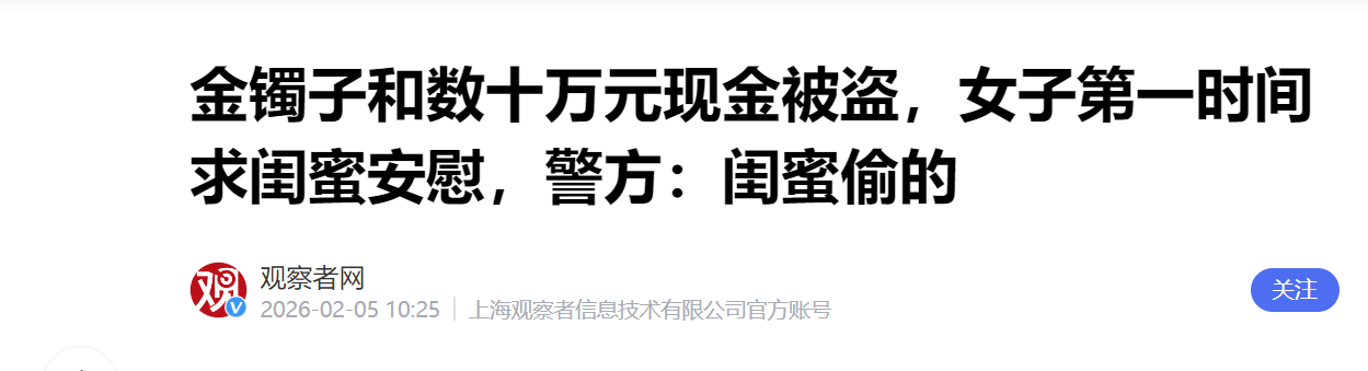 金镯子和数十万元现金被盗,女子求闺蜜安慰,警:闺蜜偷的