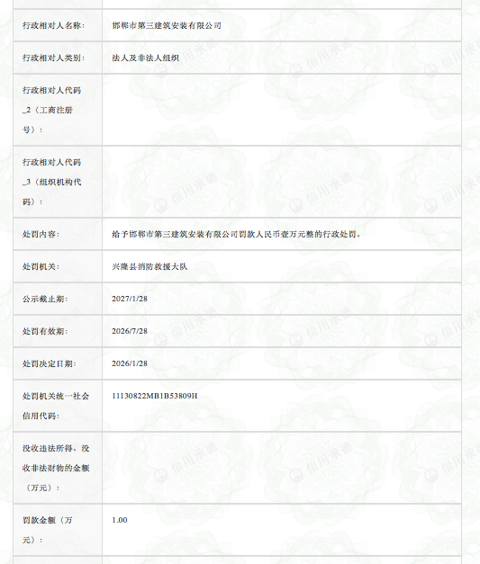 据信用中国(河北承德)官网消息,2026年1月28日,因未严格落实单位内部动火审批制度,导致施工现场引发火灾,邯郸市第三建筑安装有限公司被兴隆县消防救援大队处以罚款1万元。