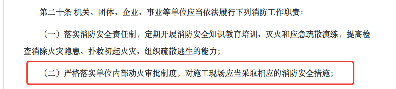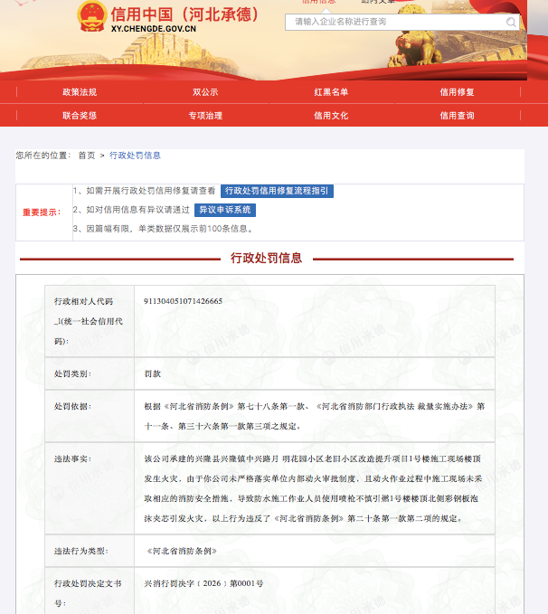具体来看,文号“兴消行罚决字﹝2026﹞第0001号”行政处罚决定书显示,邯郸市第三建筑安装有限公司承建的兴隆县兴隆镇中兴路月明花园小区老旧小区改造提升项目1号楼施工现场楼顶发生火灾,由于该公司未严格落实单位内部动火审批制度,且动火作业过程中施工现场未采取相应的消防安全措施,导致防水施工作业人员使用喷枪不慎引燃1号楼楼顶北侧彩钢板泡沫夹芯引发火灾,以上行为违反了《河北省消防条例》第二十条第一款第二项的规定。