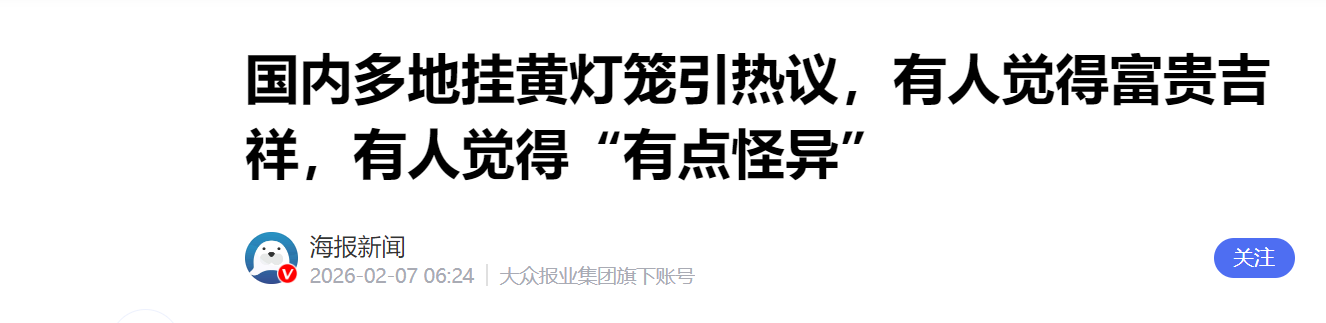 不过,也有国内其他地方此前挂黄灯笼被市民吐槽的。据上游新闻报道,去年1月,四川乐山街头黄灯笼被吐槽“风格怪异”,施工方表示,计划加装红灯笼整改。