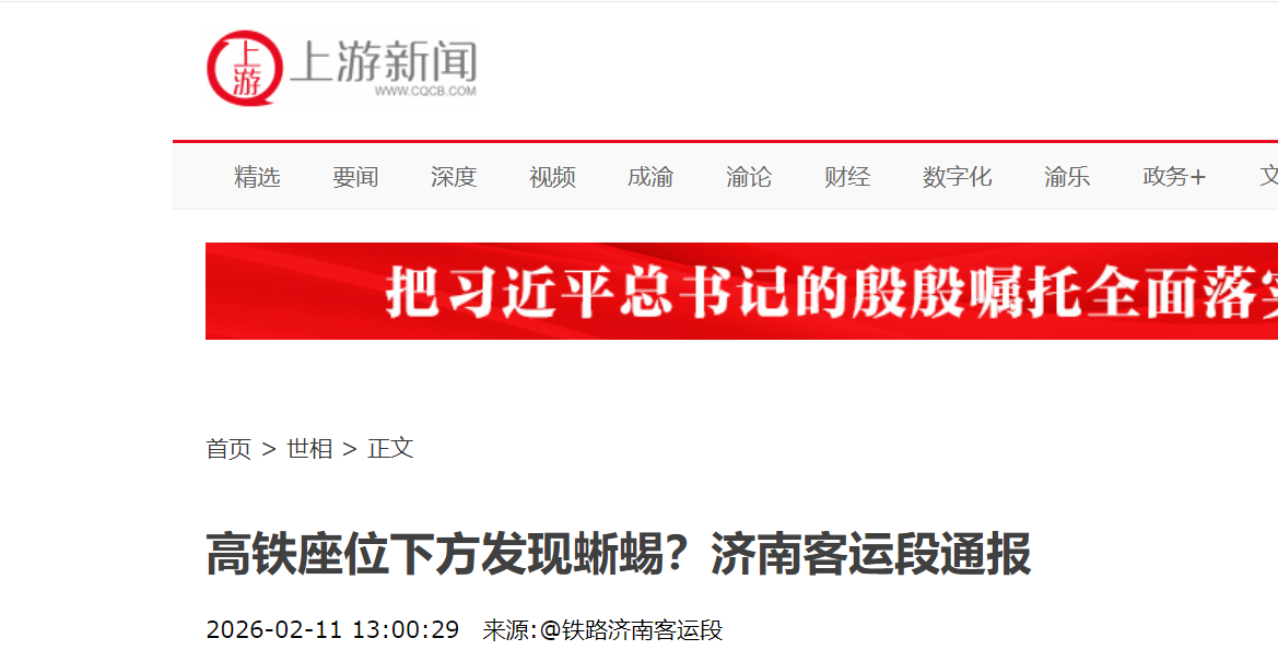 经查,2026年2月2日16时35分,我段值乘的济南东至重庆西的G481次列车,运行至洛阳龙门至华山北区段时,工作人员在2车4F坐席收取垃圾时,发现前排座椅下方缝隙处有一只长约10厘米的蜥蜴,随即报告列车长。列车长与乘警迅速赶到现场,于16时43分将蜥蜴妥善处置。随后,列车长为2车4F旅客调换至其他车厢就坐,并向旅客诚挚表达歉意。