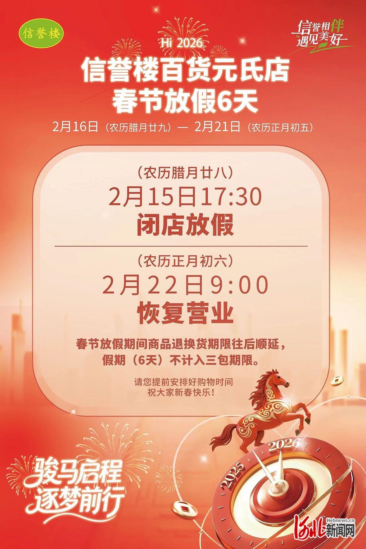 据信誉楼百货工作人员介绍,今年春节期间,信誉楼百货全国门店将统一放假,石家庄地区门店也不例外。具体放假时间为腊月二十八下午5点半至正月初六上午9点,共计6天,且为带薪休假。这一放假传统自1984年信誉楼百货创立以来便一直坚持,至今已有40余年。信誉楼百货官方推文表示,春节放假旨在让员工充分休息、陪伴家人,享受天伦之乐。同时明确,放假期间所有商品的退换货期限将相应顺延,不计入三包期限,切实保障顾客安心过年、放心购物。