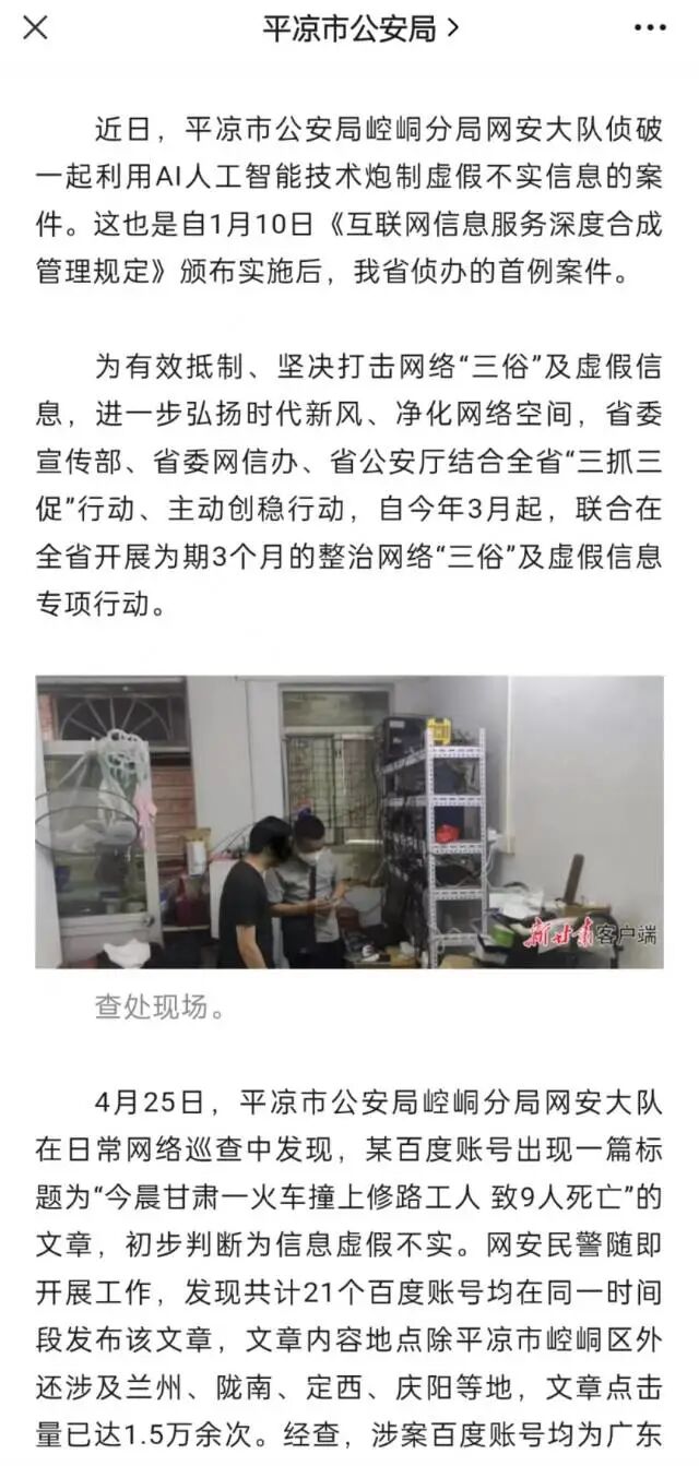 此前,一篇题为《今晨甘肃一火车撞上修路工人致9人死亡》的“新闻”吸引了甘肃省平凉市警方的注意,并引发网友关注。经判定,这是一篇假新闻,警方进一步侦查发现,这是一起利用AI人工智能技术炮制虚假不实信息的案件,而涉案的账号则为深圳的一家自媒体公司所有。