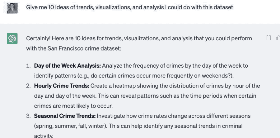 作者首先上传一个CSV格式数据集,然后问ChatGPT都能怎么分析或处理这些数据,给出10条建议。