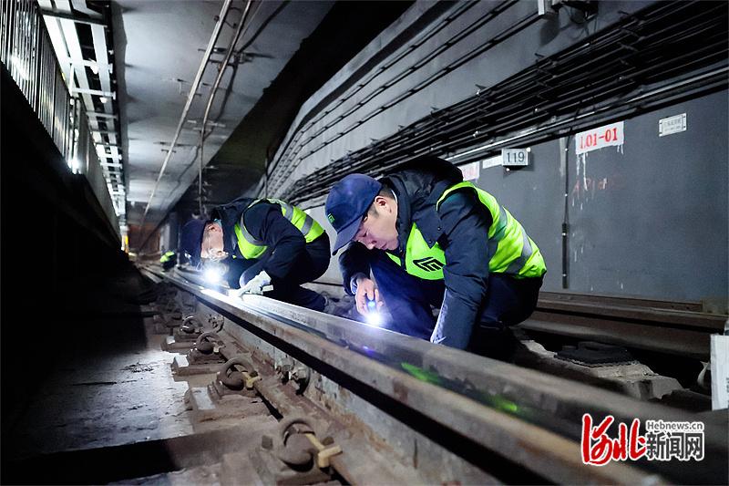 2月14日凌晨,石家庄地铁一号线轨道一工班工长张昭辉(右一)和工友们在地铁隧道内进行钢轨巡检作业。河北日报记者 刘冰洋摄