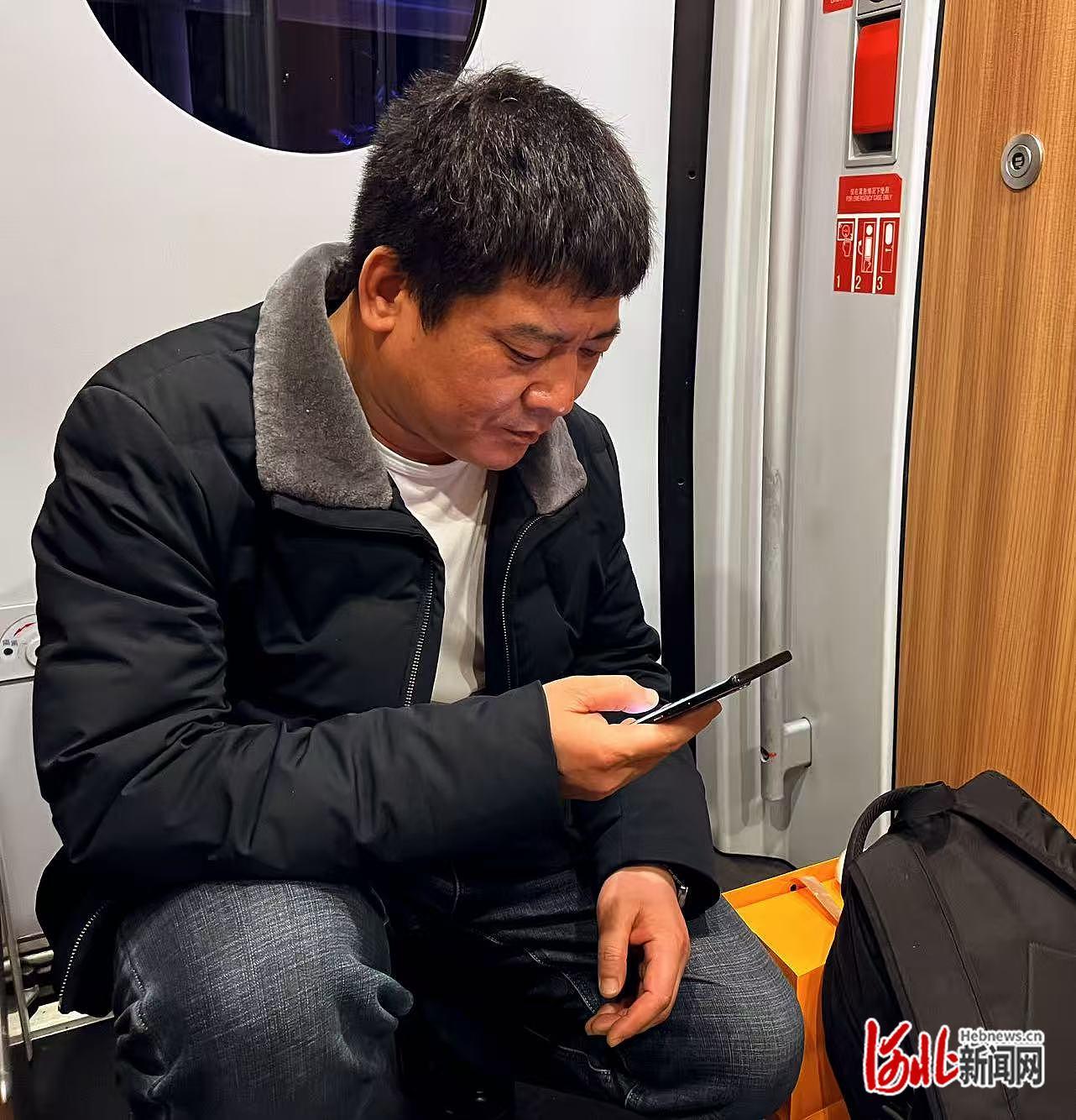 记者和赵兵一起上了6号车厢,穿过几节车厢后,在过道处,一位身穿黑色夹克、手提一袋茶叶的中年男子引起了记者的好奇。他蹲在过道旁,一直看着手机,脸上有时露出一丝笑容。他叫蒋积德,42岁,从事机电安装工程20余年,常年辗转于天津、西安等地的工地。这一次,他刚从天津飞抵西安,又马不停蹄登上这趟返回故乡庆阳的列车——这次是他外出务工十多年回家最晚的一次。