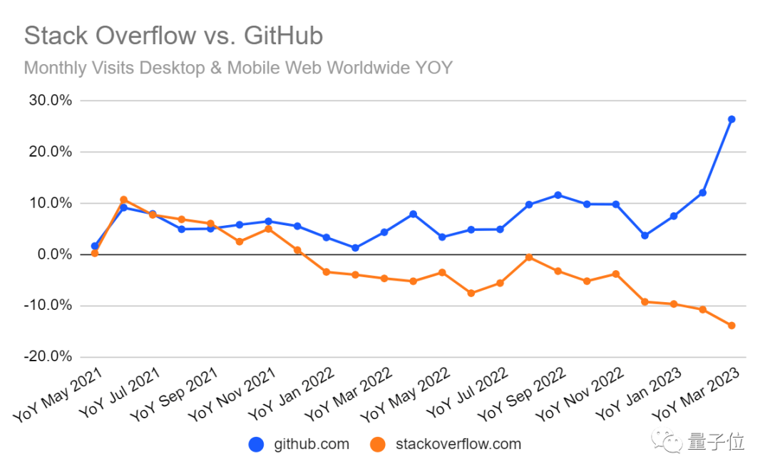实际上,在ChatGPT出现之前,StackOverflow就已开始受到GitHub Copilot的冲击,访问量开始走低。