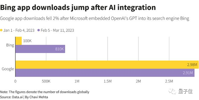 今年2月,必应宣布集成ChatGPT能力后,访问量增涨9%,与此同时谷歌下降了3.1%。