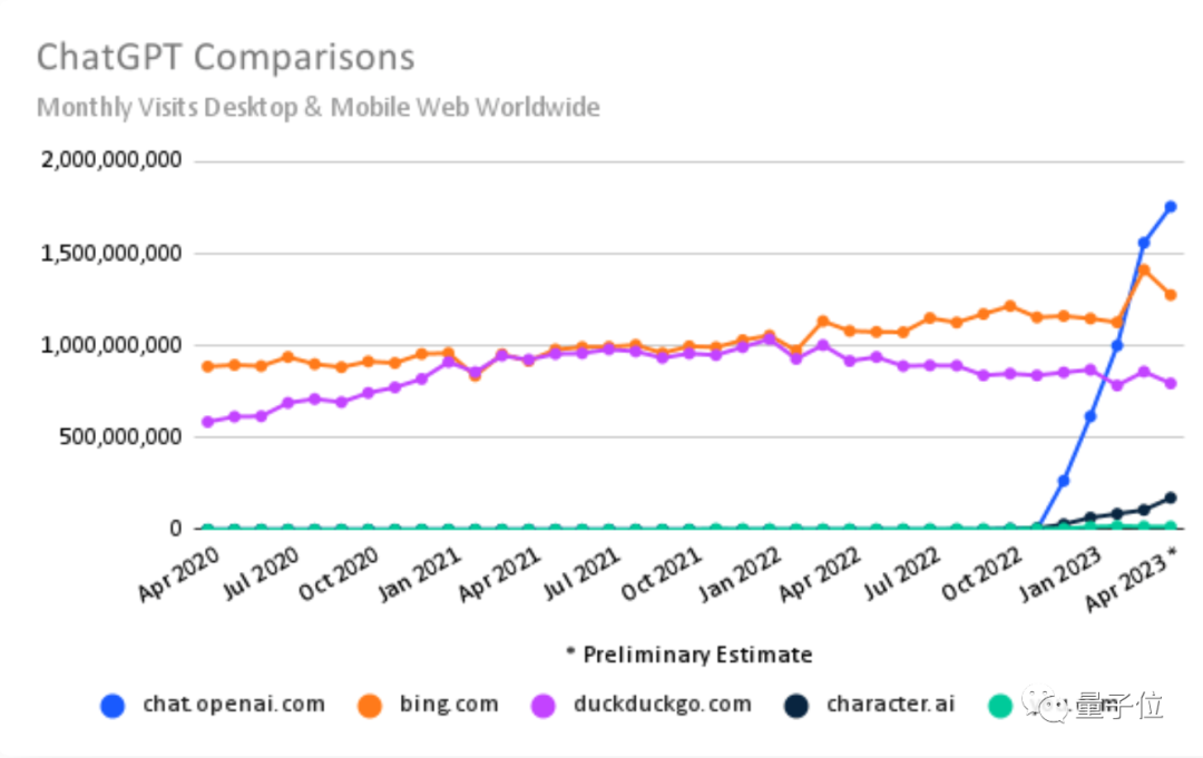 量子位 | 公众号 QbitAIChatGPT上月全球访问量 17.6 亿次,已达到谷歌的2%!