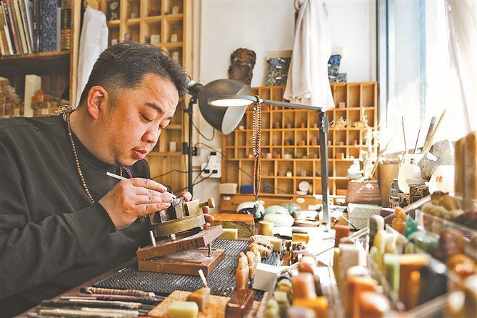 一方寿山石,温润如脂,刀过处,石屑轻扬。篆刻家陈思远为厦门日报读者刻下的马年贺正印章,在刻刀与石面的摩挲间渐渐清晰——印文是“日日寸进”。
